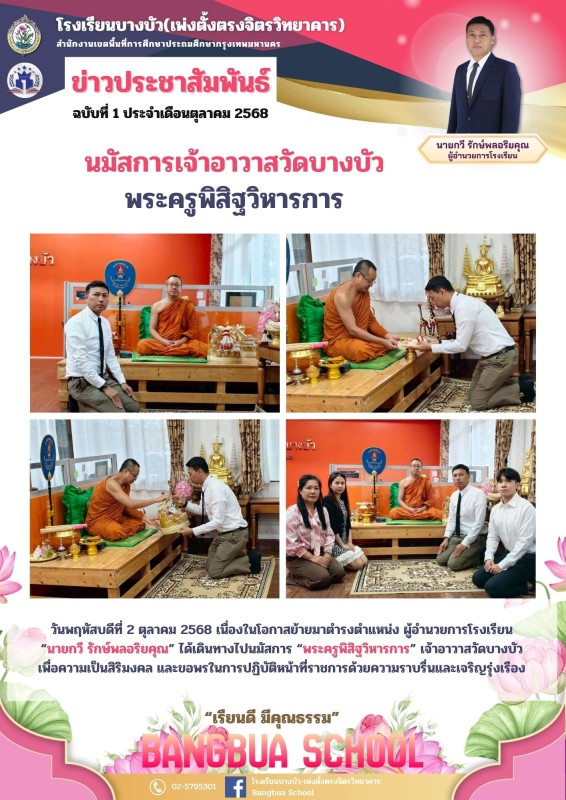 ผู้อำนวยการโรงเรียน “นายกวี รักษ์พลอริยคุณ” ได้เดินทางไปนมัสการ “พระครูพิสิฐวิหารการ” เจ้าอาวาสวัดบางบัว เพื่อความเป็นสิริมงคล และขอพรในการปฏิบัติหน้าที่ราชการ